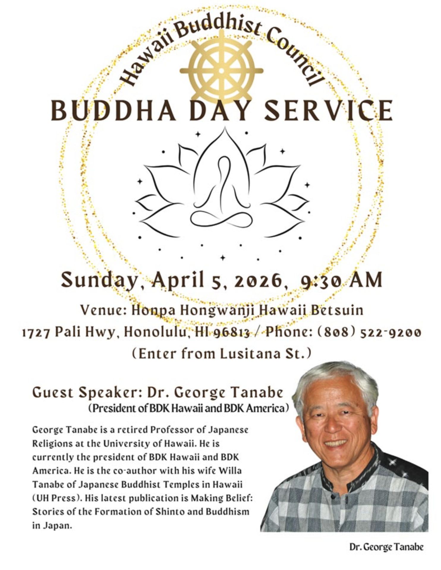 Please attend the Hawaii Buddhist Council Buddha Day Service at Honpa Hongwanji Hawaii Betsuin on Pali Highway.